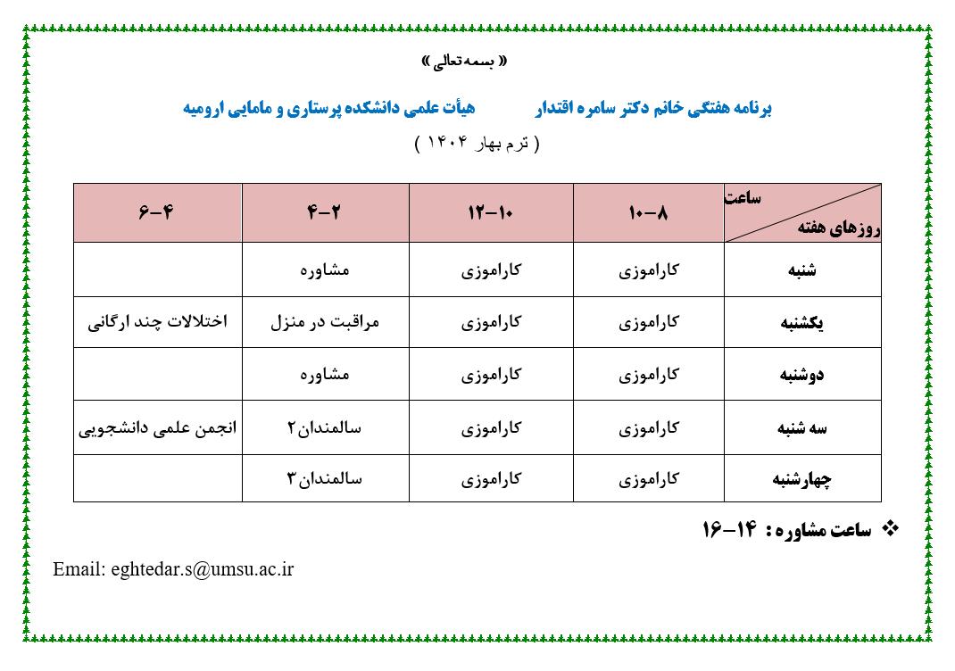 مدرک تحصیلی: Ph.D رشته تحصیلی: پرستاری مرتبه علمی: استادیار گرایش: داخلی جراحی سمت: هیئت علمی دانشکده پرستاری و مامایی ارومیه ایمیل: eghtedar_nurse@yahoo.com شماره مستقیم: - شماره تلفنخانه: 4-32754961 داخلی: 285 رزومه طرح درس و دوره برنامه هفتگی پورتال اساتید علم سنجی |